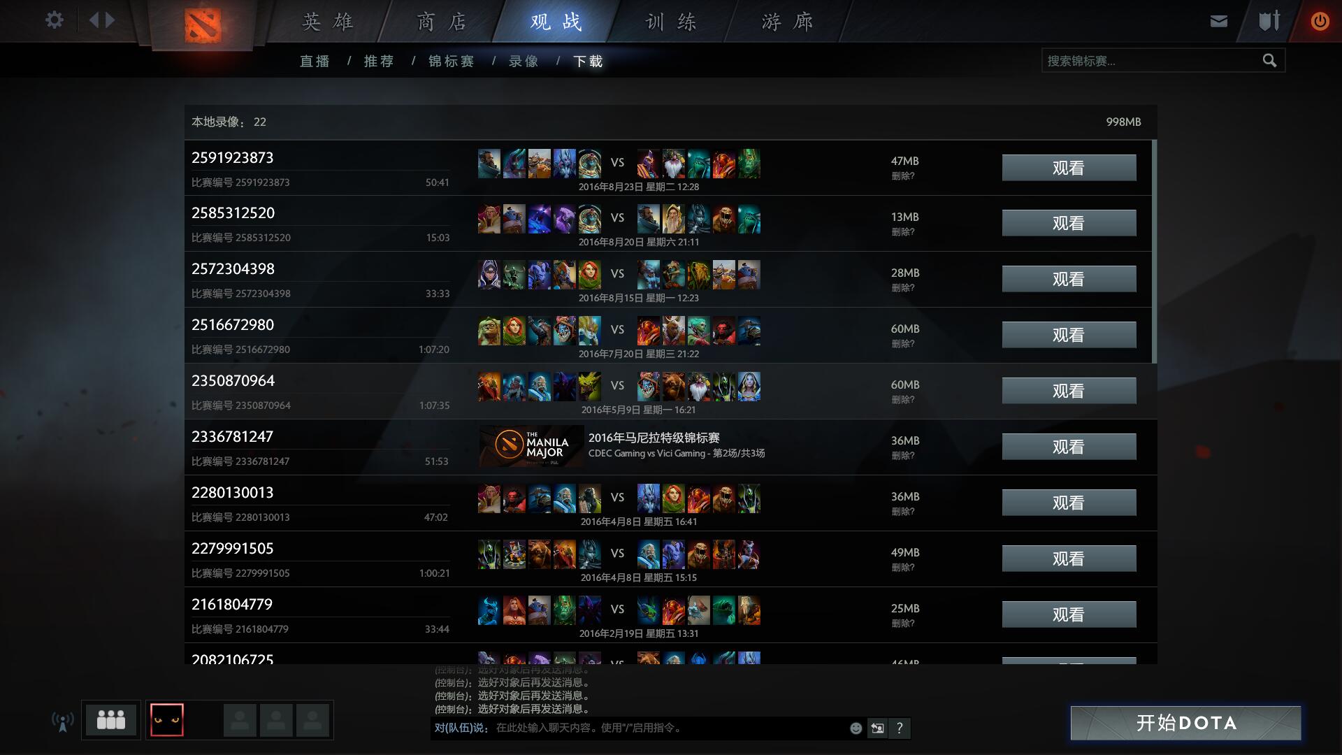 观战页面下会有所有职业比赛,直播的比赛将会有相应的提示。也可以点击“正在进行的游戏”观看受到大家欢迎的路人比赛。打开玩家资料可以看到过去的所有比赛,点击其中一场即可打开比分面板,下载该场比赛的录像进行观看。