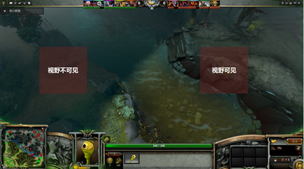 在DOTA2的地图中,你可以看到地图上任何地方的地形,但只能看到盟军单位或英雄视野范围内的敌人。图中明亮的区域是可视范围,而其他较暗的区域则为不可见范围。一般来说,视野会受到上下坡和树林的影响,白天的视野相对于夜晚也会宽广。