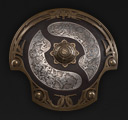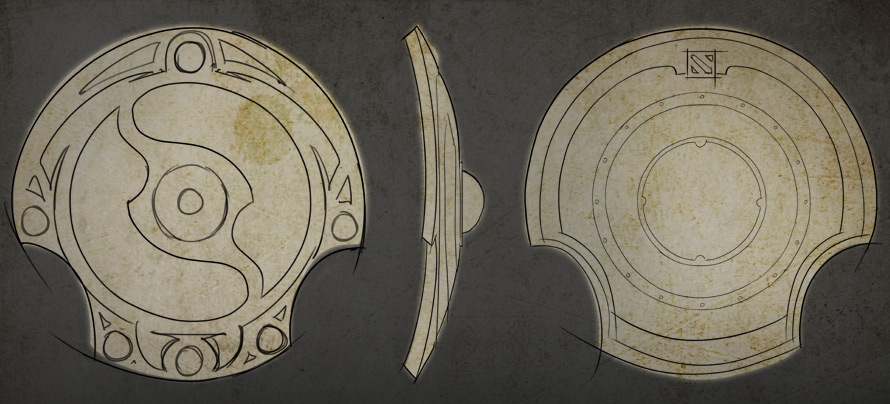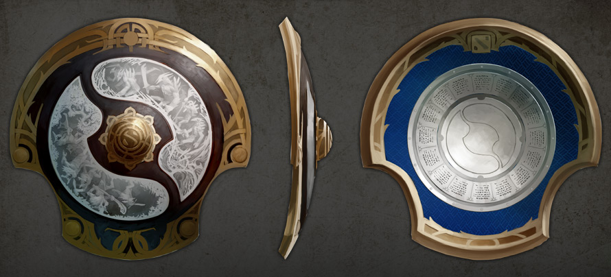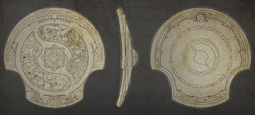 设计灵感来源于挪威与中国,我们希望盾牌一方面能够适合我们的英雄阵容,另一方面仍然保持精致与简洁的整体设计。因为冠军盾既是一件游戏内的实用性道具,又是奖杯,所以被设计成有两处圆形凹进,这可以让胜利者很自然的举起它。冠军盾最吸引人的地方在于它的中部浮雕,描绘了DOTA2中天辉与夜魇无休止的斗争。总之这座奖杯是独一无二的精美物件,值得王者中的王者去庆祝与捍卫。