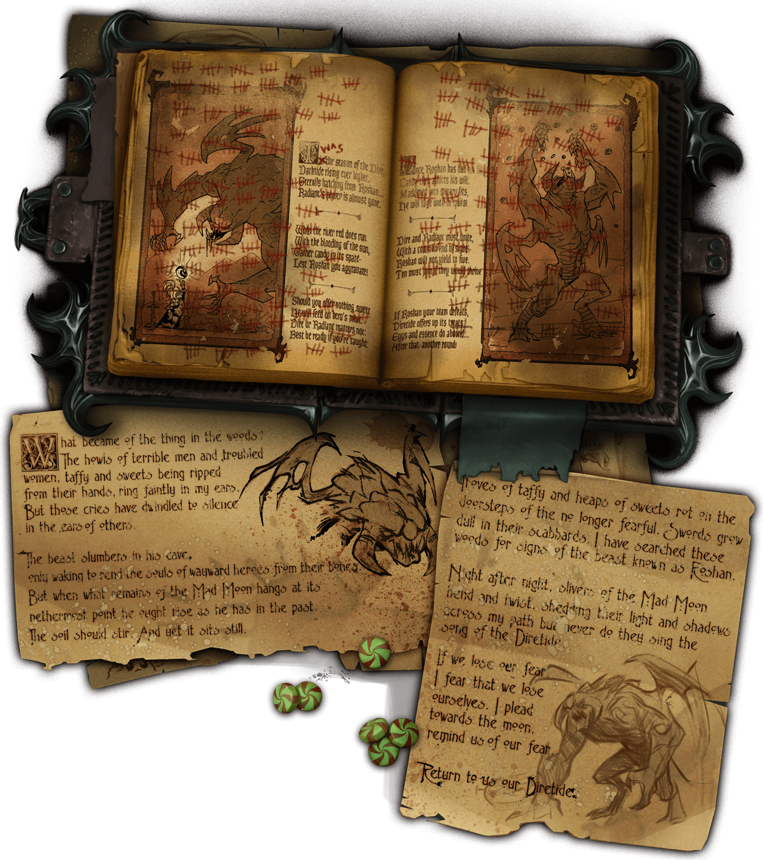 破碎的癫狂之月低悬在夜空中。春去夏来,夏去秋来;季节的更迭在不断继续,述说着天辉和夜魇之间无休止的冲突。而其中那些短暂的时光,我们不再关注幽林的时光,却已被长久遗忘。夜魇暗潮的季节哪里去了?我们朝幽林大喊,乞求为糖痴狂的巨兽会再次现身。可是毫无动静。而我们继续前行。